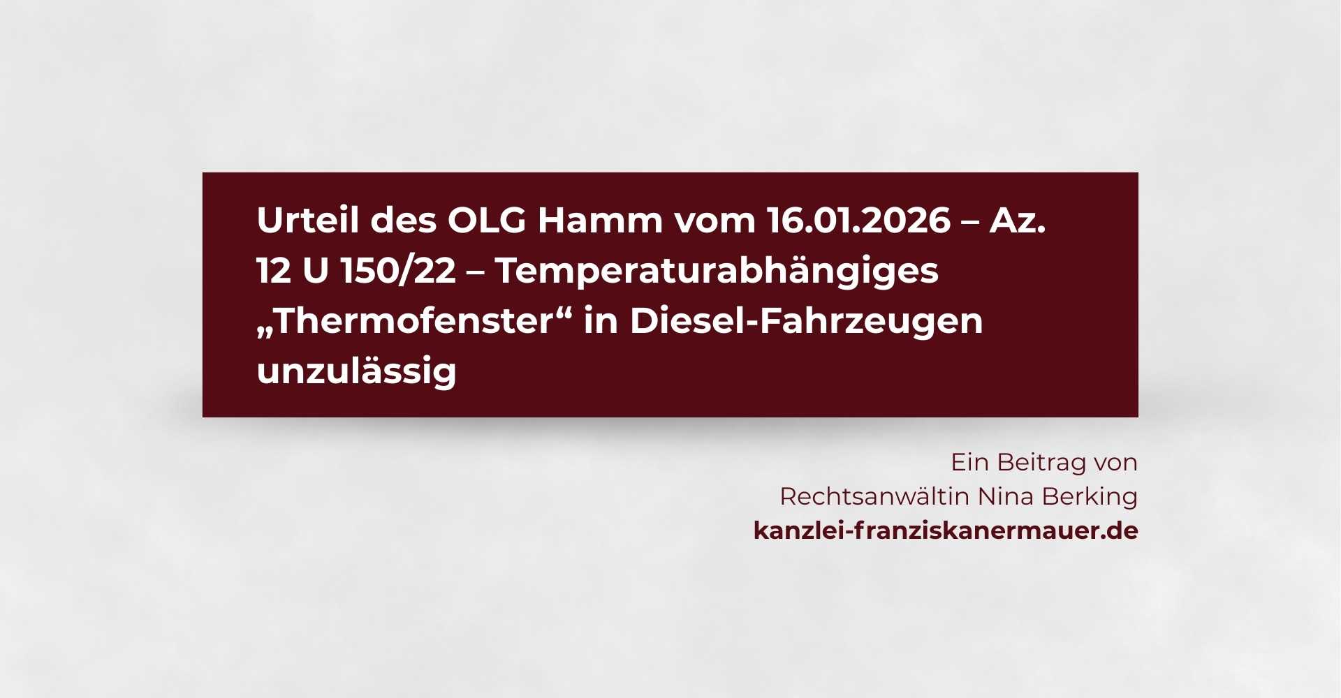 Neues vom OLG Hamm zum „Thermofenster“ Das OLG Hamm hat mit Urteil vom 16.01.2026 (Az. 12 U 150/22) entschieden, dass ein temperaturabhängiges „Thermofenster“ in Diesel-Fahrzeugen